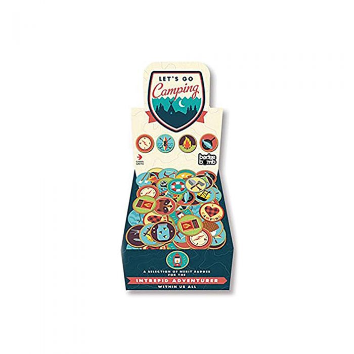 The Camp Button box includes an assortment of 24 unique designs, including the phrases, "Collect Moments Not Things," "Camp More, Worry Less," "Nomad," and "Read Outside" are found in the Camp Happy button box collection.
